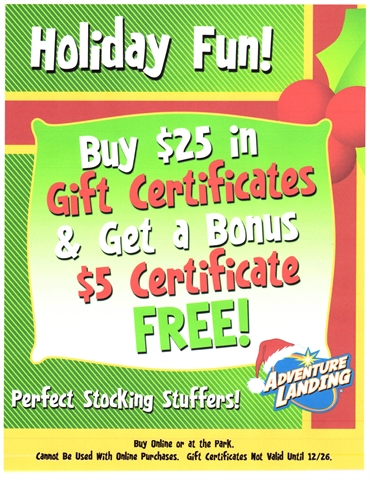 Holiday Gift Certificate SaleBuy $25 worth of gift certificatesGet $5 worth FREE!Certificate valid after 12/25/25.Not valid for group or birthday purchases.Not valid with any other coupons or specials.